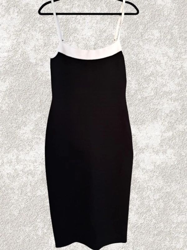 This A line sheath dress from Express features a color block pattern in black, perfect for a party or cocktail occasion. The sleeveless design and knee length make it ideal for summer, while the polyester material provides stretch for added comfort. The stylish sheath silhouette and colorful theme add a fun and vibrant touch to your wardrobe, making it a versatile and chic option for any special event.